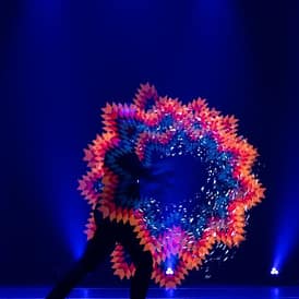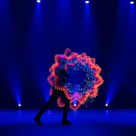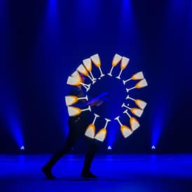 Die Absolventin der Staatlichen Artistenschule Berlin begeistert das Publikum sowohl mit ihrer Jonglage im Scheinwerferlicht als auch im Dunklen mit ihren LED-Poi.